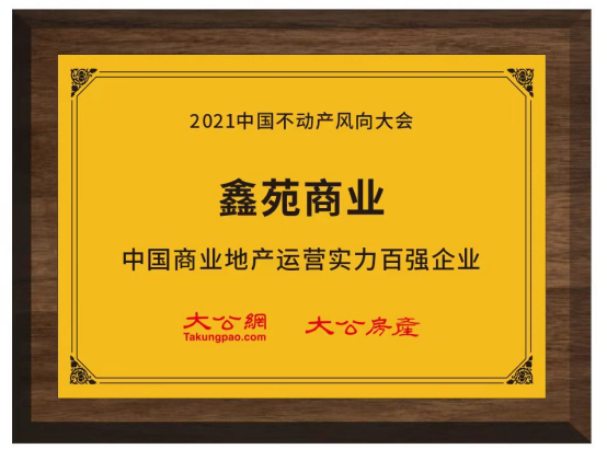 基于此,大公房产在2021中国不动产风向大会企业榜样评选中,授予鑫苑商业“中国商业地产运营实力百强企业”企业称号。