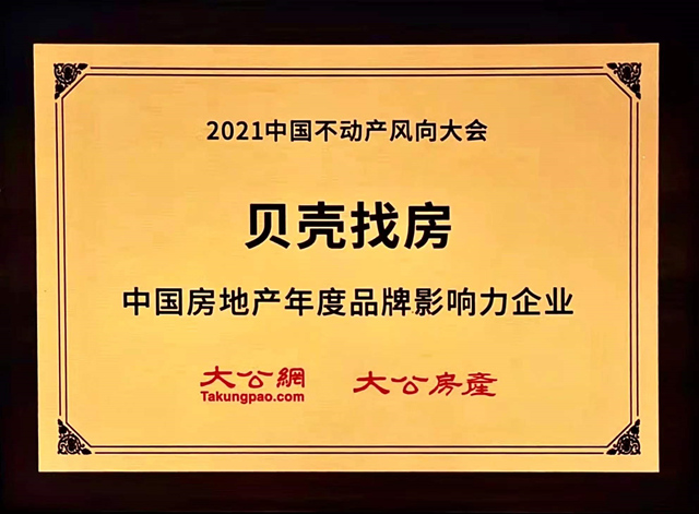 基于此,大公房产在2021中国不动产风向大会企业榜样评选中,授予贝壳找房“中国房地产年度品牌影响力企业”企业称号。