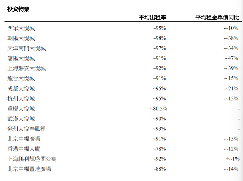 此外,除了未披露平均租金单价同比情况的重庆大悦城、武汉大悦城和苏州大悦春风里,以及上海鹏利辉盛阁公寓同比增加1%外,其余11个项目的平均租金单价均同比下降,下降幅度最大的是沈阳大悦城,同比下降47%。