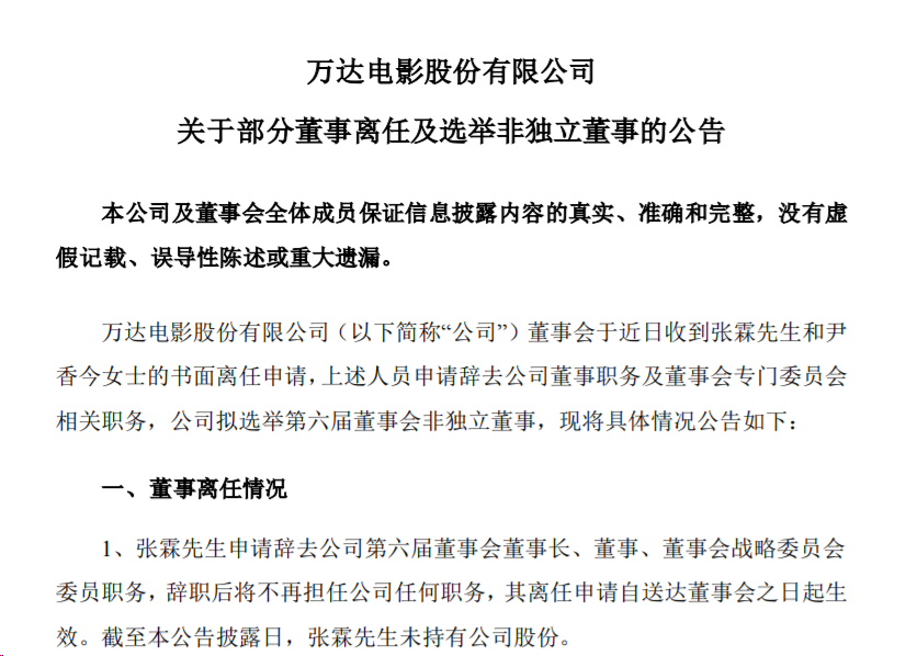 根据公告,近日,万达电影收到张霖、尹香今、王大治的书面历任申请,二者申请辞去公司董事及董事会专门委员会相关职务。其中张霖辞去公司第六届董事会董事长、董事、董事会战略委员会委员职务,尹香今辞去公司第六届董事会董事、董事会薪酬与考核委员会委员职务,王大治辞去公司第六届监事会非职工代表监事。
