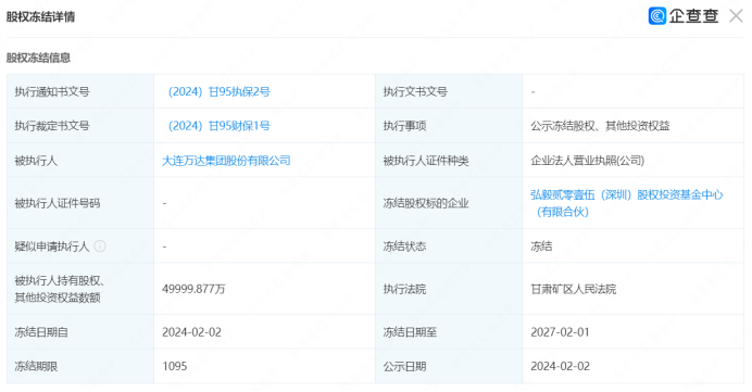 大公房产讯 企查查App显示,近日,大连万达集团股份有限公司新增一则股权冻结信息,被冻结股权数额4.99亿余元,股权被执行企业为弘毅贰零壹伍(深圳)股权投资基金中心(有限合伙),冻结期限自2024年2月2日至2027年2月1日,执行法院为甘肃矿区人民法院。