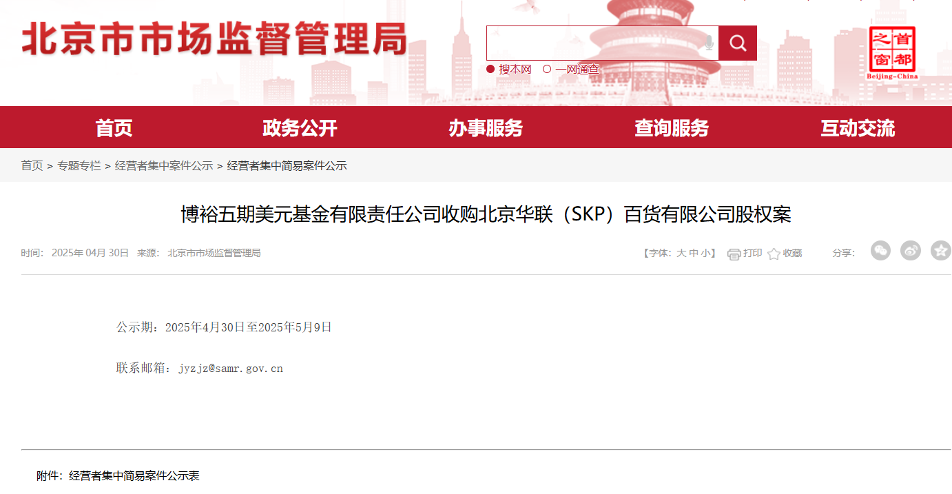 根据北京市市场监督管理局发布的公示信息,博裕基金通过其关联方拟收购北京SKP部分股权。
