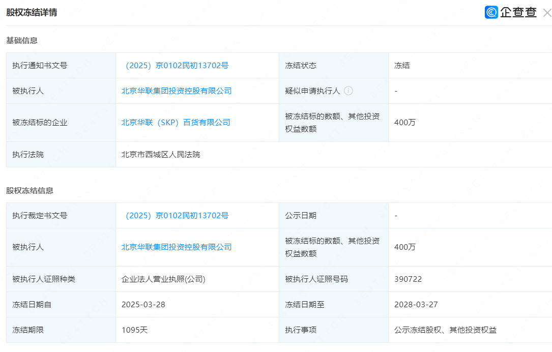 此外,企查查股权信息显示,截至5月7日,华联集团持有北京SKP约40%的股权,持股数约400万。目前这笔股权因涉及民事诉讼被法院冻结,冻结期起止时间为2025年3月28日至2028年3月27日。