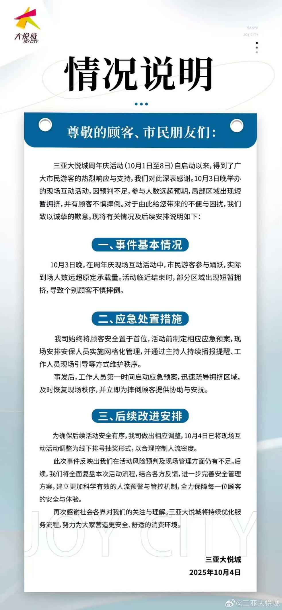 10月4日晚,三亚大悦城发布在官方微博发布“情况通报”称,3日晚举办的现场互动活动,因预判不足,参与人数远超预期,局部区域出现短时拥挤,并有顾客不慎摔倒。“对于由此给您带来的不便与困扰,我们致以诚挚的歉意。”
