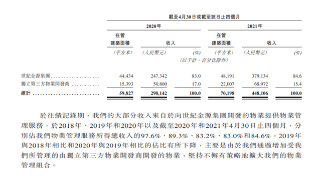 即便二次递表,世纪金源服务依旧存在一些“老”问题没有得到解决。招股书显示,截至2021年4月末,公司物业管理服务业务收入4.48亿元,占总营收比重达78.3%,与2020年79.4%的占比相比,仅下降1.1个百分点。