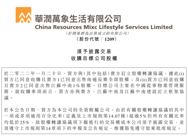 公告显示,创润发展有限公司为华润万象生活全资附属公司,在本次交易中作为买方,已同意收购且香港彩虹物业有限公司已同意出售南通长乐全部股权,同时,已同意收购且香港乐活物业有限公司已同意出售江苏中南1%股权。
