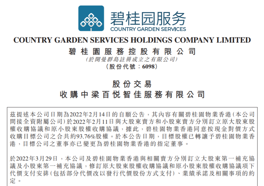 大公房产讯 3月29日晚间,碧桂园服务发布关于收购中梁百悦智佳服务有限公司的公告。
