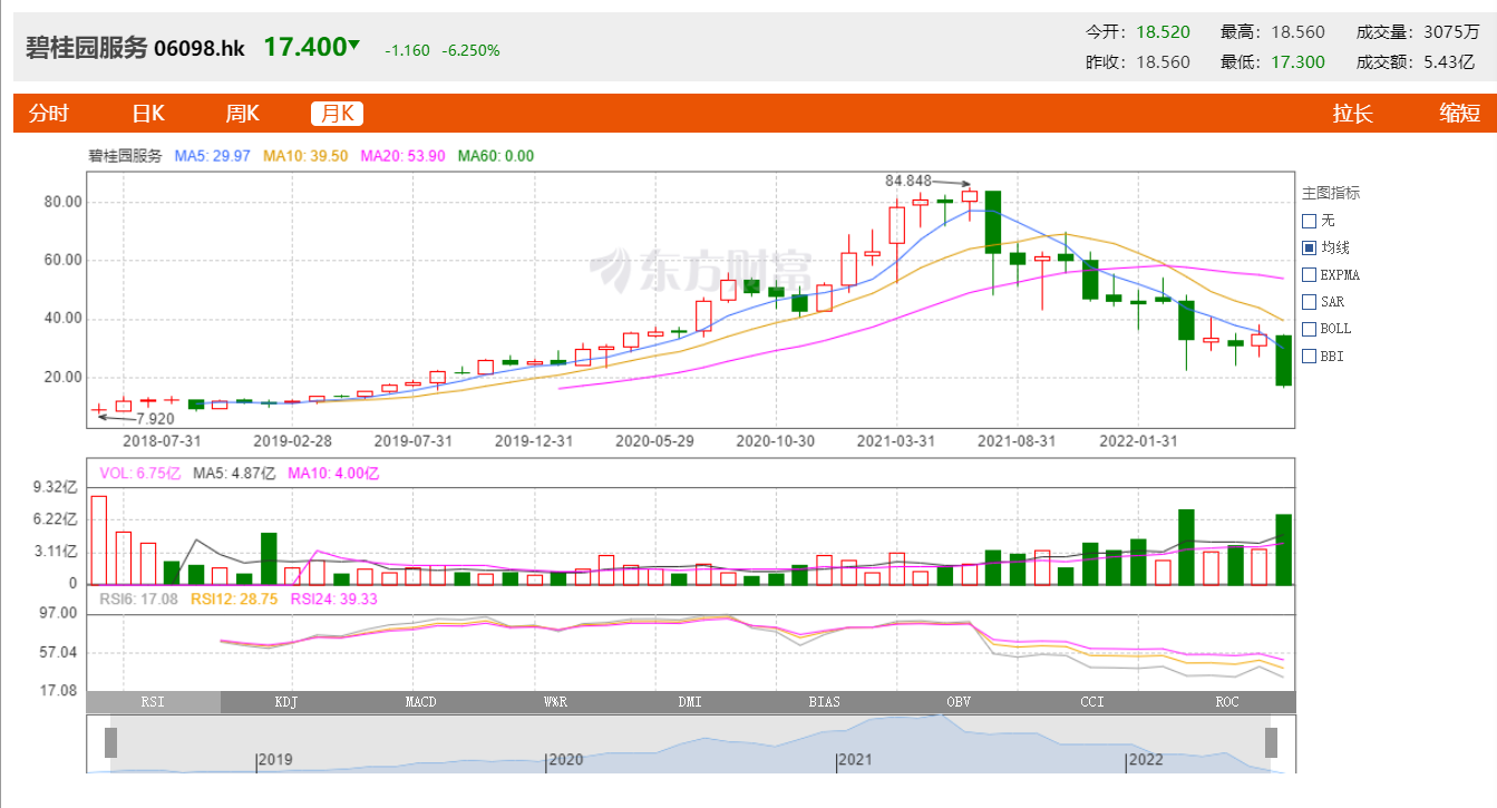 其中,碧桂园服务在2021年6月份股价曾涨到每股85港元,后来逐渐降至每股20港元左右,市值也从最高时近3000亿港元下降到了760亿港元。