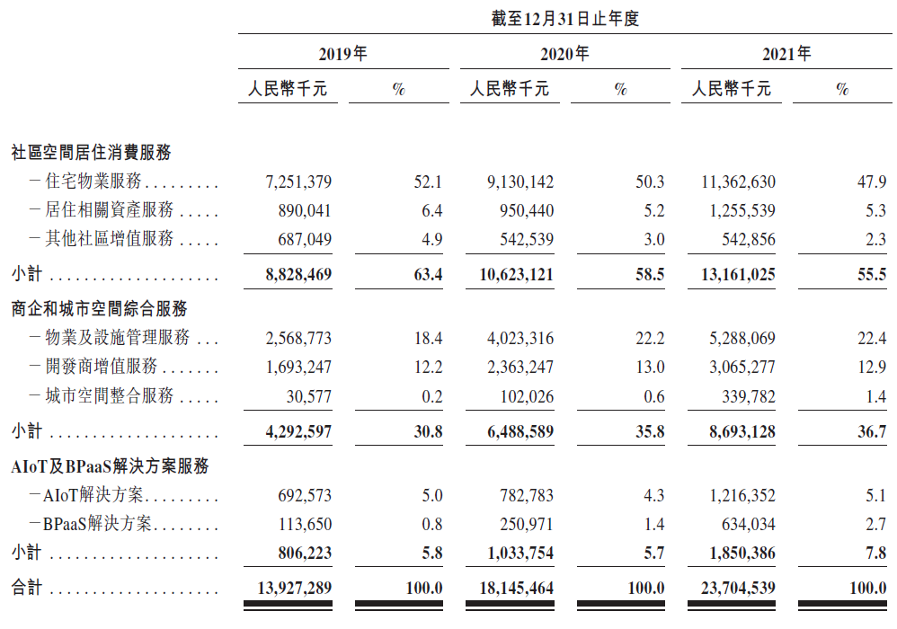 招股书显示,万物云收入来自社区空间居住消费服务、商企和城市空间综合服务及AIoT及BPaaS解决方案服务。于2019年、2020年及2021年,总收入分别为139.27亿元、181.46亿元及237.05亿元;利润分别为10.4亿元、15.19亿元、17.14亿元;非《国际财务报告准则》利润分别为11.53亿元、15.92亿元、18.88亿元。