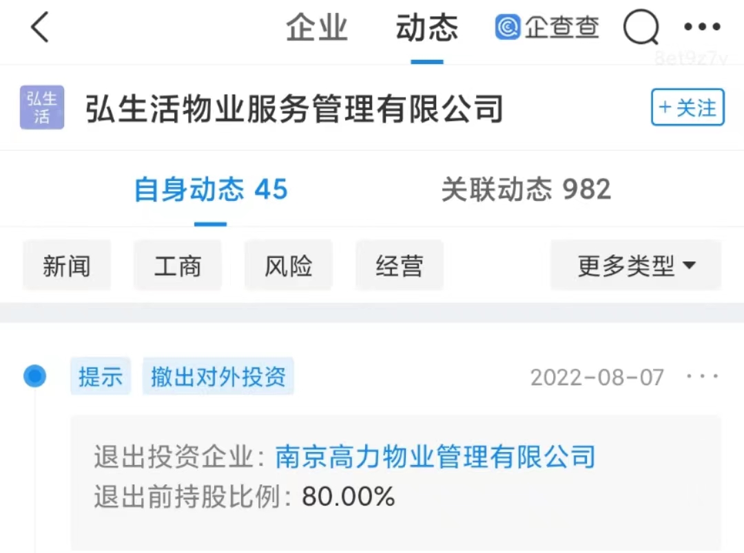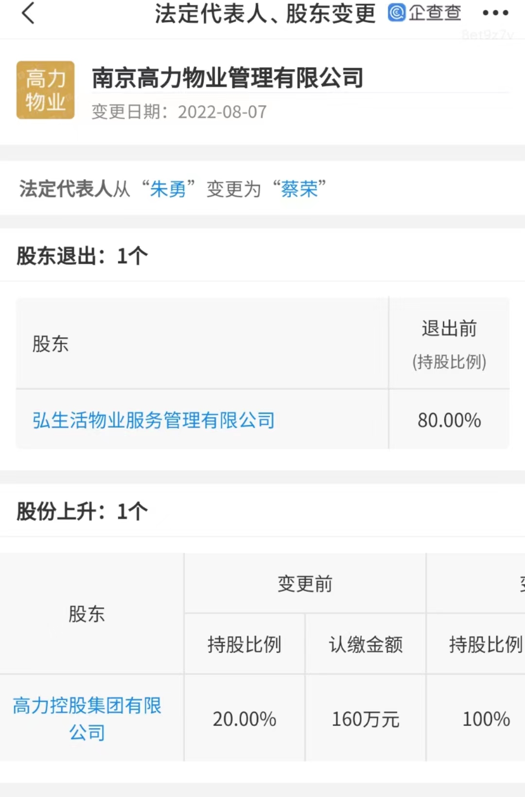 提示显示,弘生活退出南京高力物业管理有限公司(以下简称“高力物业”)80%股权,高力控股集团有限公司(以下简称“高力控股”)接盘。