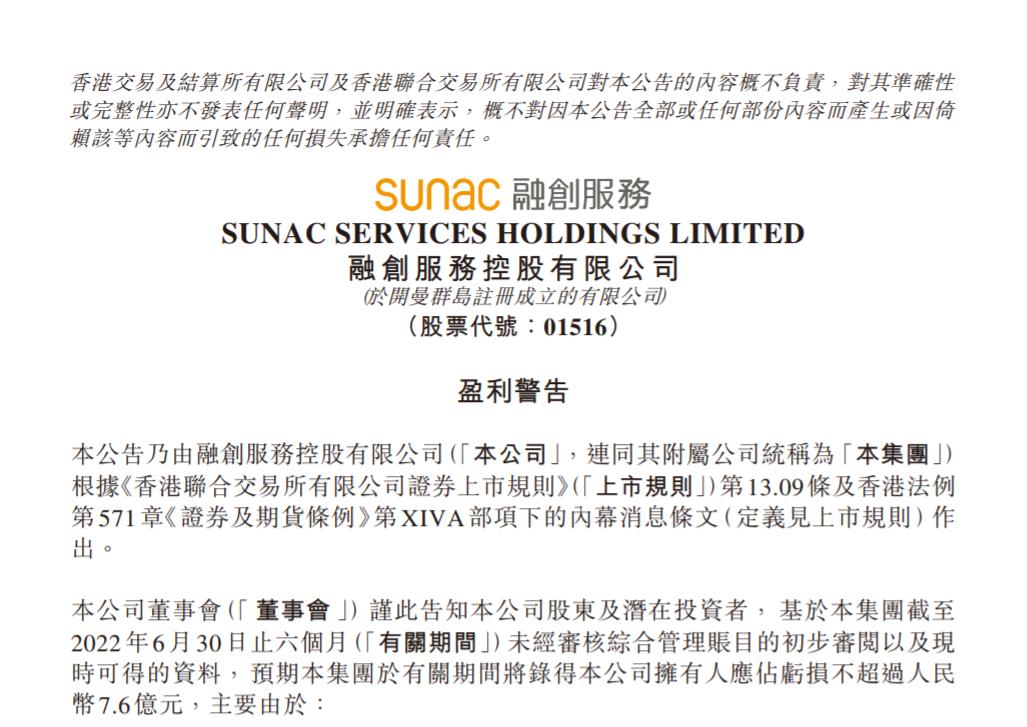 公告称,预计公司2022年上半年公司拥有人应占亏损不超过7.6亿元。