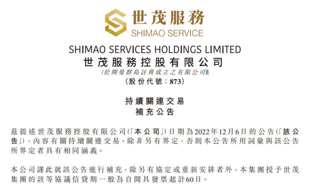 大公房产讯 1月19日晚间,就信贷事宜及若干境外债务未付情况,世茂服务(00873)发布持续关连交易补充公告称: