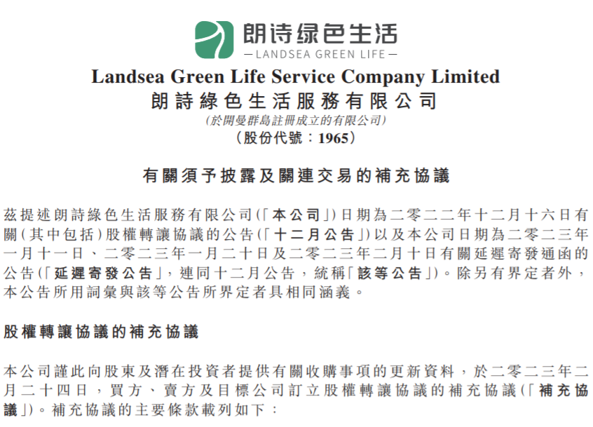大公房产讯 2月27日,朗诗绿色生活发布有关须予披露及关连交易的补充协议。