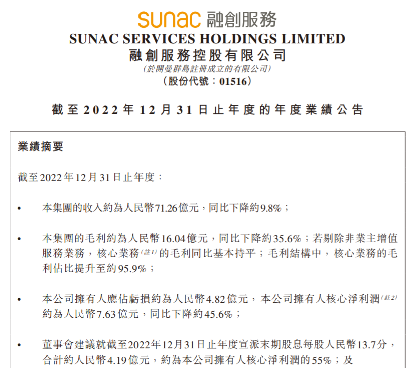 融创服务董事会建议,就截至2022年12月31日止年度宣派末期股息每股人民币13.7分,合计约4.19亿元,约为公司拥有人核心净利润的55%。