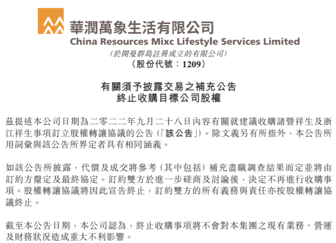 公告显示,华润万象生活与祥生物业于进一步磋商及讨论后,决定不再进行收购事项。股权转让协议将因此宣告终止,订约双方的所有义务与责任亦按股权转让协议终止。