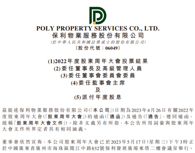 同时,保利物业方面宣布,廖模琼及杨海波获委任为该公司第三届监事会股东代表监事。经该公司职工代表大会选举,穆静获委任为该公司职工代表监事。上述监事任期自2023年5月17日起至第三届监事会任期届满之日止,任期三年。