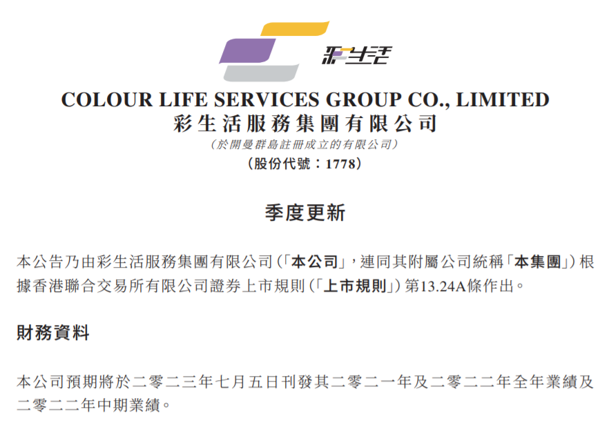 自2022年4月1日起,彩生活暂停于联交所买卖。今年4月3日,彩生活发布公告称公司核数师仍在就集团2022年度业绩报告进行审核工作,全年业绩审核工作无法于2023年3月31日之前完成。