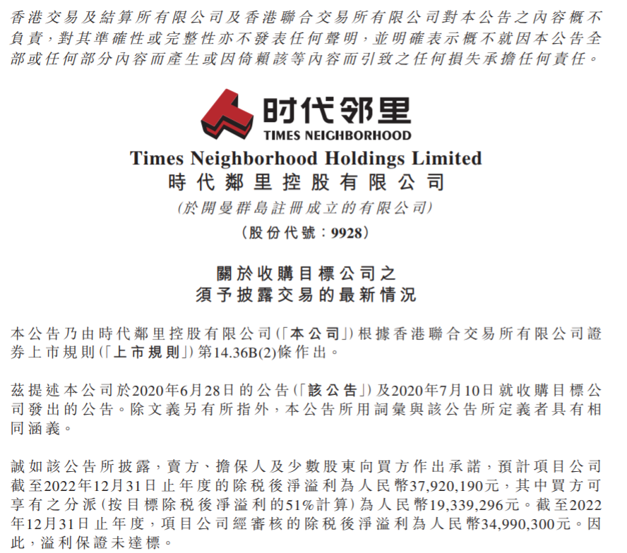 大公房产讯 9月22日,时代邻里控股有限公司发布关于收购目标公司之须予披露交易的最新情况。