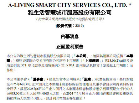 公告显示,截至2025年6月30日止六个月,雅生活服务及其附属公司(以下统称“集团”)未经审核股东应占利润预期介乎于约人民币3.00亿元至人民币4.00亿元之间,而2024年6月30日止六个月的未经审核股东应占亏损则为人民币16.3亿元。