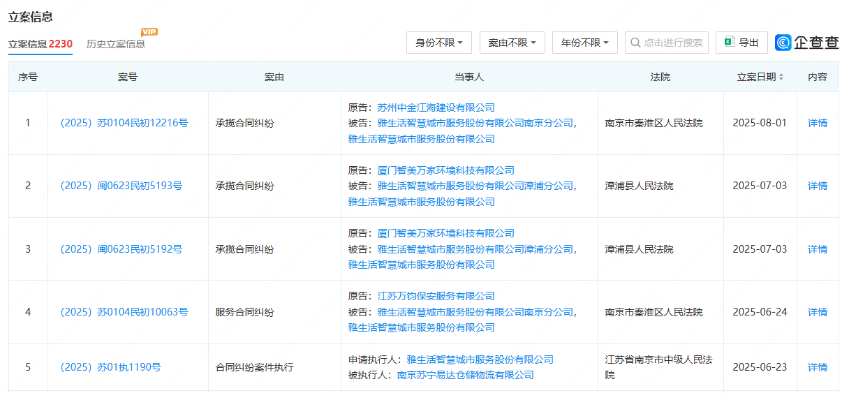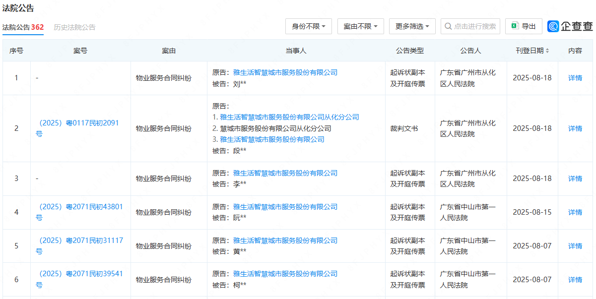 此外,企查查数据披露,截至2025年8月19日,雅生活服务存在10条被执行人案件,被执行总金额约241.83万元;另外雅生活服务还深陷多起承揽合同纠纷、服务合同纠纷等案件。