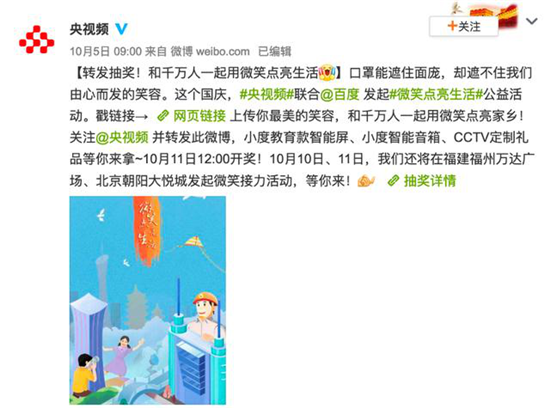 (图示:央视频官微宣布与百度发起“微笑点亮生活”活动)