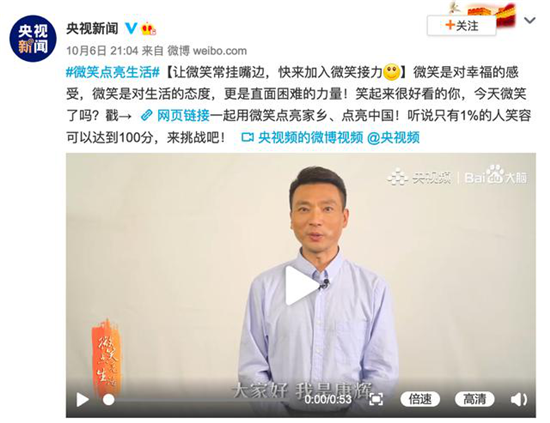 据悉,“微笑点亮生活”是继百度世界2020后,百度与中央广播电视总台的再度携手。10月5日,央视频在官方微博发起活动。随后康辉、海霞等人们熟悉的总台央视主持人也通过视频,向大家发出了“微笑点亮生活”的邀请。活动很快获得了网友们的热烈响应,纷纷表示要“和大家一起用微笑点亮家乡!”、“致最不平凡的2020年,双节重逢,愿好事成双。”