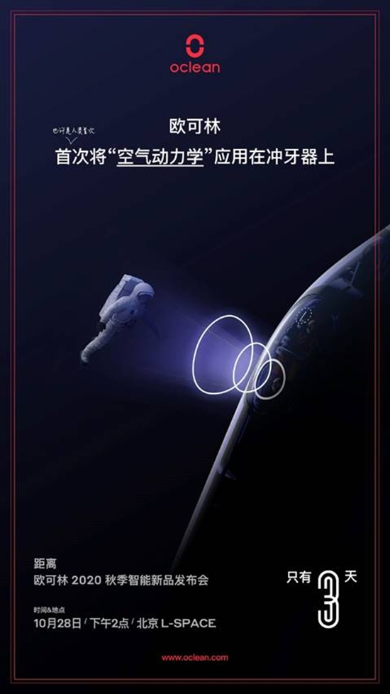 在10月25日、26日、27日连续三天发布的倒计时海报中,陆续曝光了本次发布会即将发布新品的一些信息。其中“首次将‘空气动力学’应用在冲牙器上”直接透露了本次发布会的新品——冲牙器。随着人们对口腔健康的重视,冲牙器也越来越受到欢迎,那么本次Oclean欧可林以“空气动力学”黑科技能为冲牙器带来什么颠覆性的创新呢?