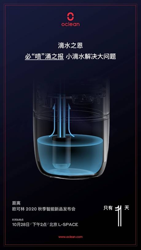 10月27日,Oclean欧可林官方微博再次发布倒计时海报,为10月28日在北京举办的Oclean欧可林2020年秋季智能新品发布会造势。本次发布会以“净无止静”为主题,让人联想到本次发布的口腔护理新品将与“干净”、“安静”有关联。