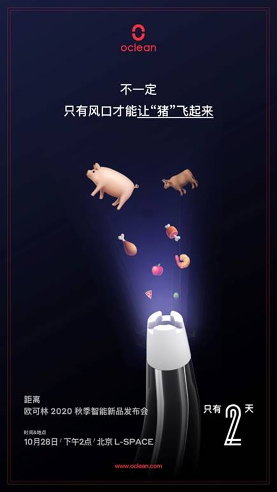 另外,海报文案还配有“不一定只有风口才能让猪飞起来”,让人联想到雷军“站在风口,猪都能飞起来”的名言。不过,不在风口的猪,如何能飞起来?这与Oclean欧可林的新品又有何关联?