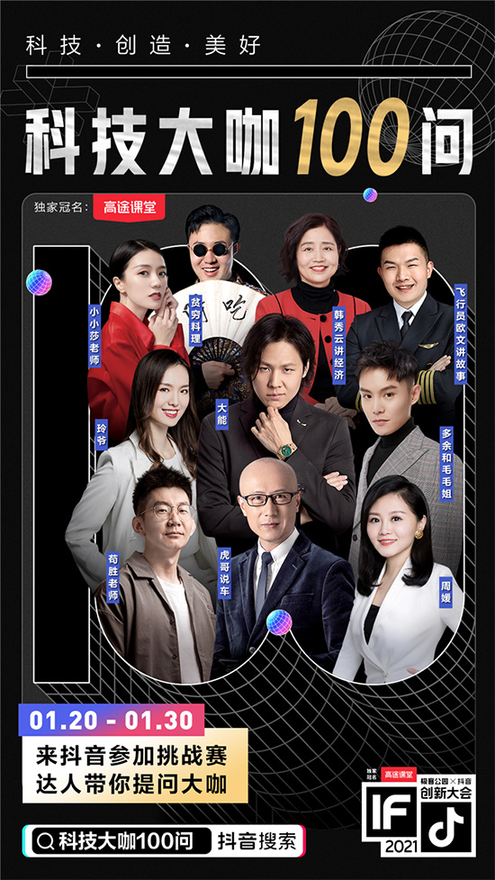 值得一提的是,作为创新大会2021的联合出品方,抖音将于1月20日提前上线#科技大咖100问 话题挑战赛,联动站内多位具有影响力的抖音达人,以独树一帜的判断力、勤学好问的探索精神和善用科技的魄力,号召所有科技爱好者来勇敢发问,高价值问题将有机会在大会现场得到科技大咖的亲自解答。