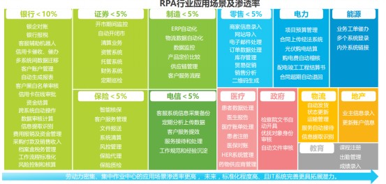 RPA尚处于发展早期,整体渗透率不高,因此不同市场对于RPA产业的需求也不尽相同。由于RPA具有高业务流程自动化,以及强稳定特性,且最适合有固定规则、结构化数据较多的场景,因此RPA天然适用于嵌入银行、证券等金融机构场景落地。而在电信作为测算渗透率接近5%的行业,在客服系统信息采集、相关数据上传分析、客户服务提效上有着较大的需求,有望成为RPA发展的沃土。