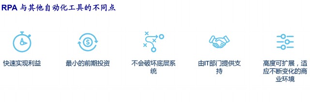 工业机器人由来已久,RPA相对于传统代替人类手工劳动的机器人,主要用于在信息系统的自动化操作,具备自动执行预定流程和跨系统协同的能力。相较于其他IT解决方案,RPA可以利用现有的基础设施来实施,而不会破坏底层系统。对于使用者来说,RPA可以RPA允许组织将之前成本和时间的一小部分进行自动化,在替换成本、盈利时间、可扩展性上都具有优势。
