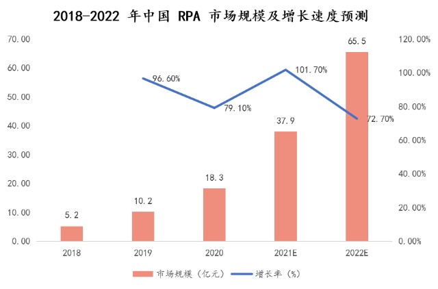 RPA技术作为新兴的人工智能落地应用之一,其产品在国内的推广时间并不长,市场尚是一片蓝海,但发展速度却非常迅速。据艾瑞咨询数据显示,2019 年 RPA市场规模为 10.2 亿元,较上年增长 96.6%;预计到2021年,整体市场规模将会达到38亿元,同比增长107.7%。随着2020年新冠疫情的爆发以及全球经济的衰退,使得大型金融企业更加关注于成本控制,增加了企业使用RPA产品的意愿。到 2023 年底,预计全球 90%的大型组织将采用某种形式的 RPA。