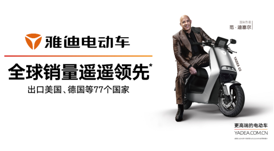 对于国际市场的布局,雅迪的脚步远远先于中国两轮电动车行业其他品牌,这使得雅迪电动车的“全球化基因”广泛而深入。截至目前,雅迪通过整合全球顶级供应链资源,已与瑞典贝格、德国拜耳、韩国LG等全球16大顶尖供应商建立合作,在全球建立了7大生产基地,全球门店突破20000家,产品出口美国、德国等83个国家,全球用户累积约3600万人,全球(2019)年销量609.37万台,连续三年全球销量第一,成为中国两轮电动车行业出海的旗舰品牌。2018年,雅迪成为行业首家FIFA世界杯赞助商;2019年,雅迪签约国际巨星范·迪塞尔作为品牌形象大使,在品牌全球化方面捷报连连。
