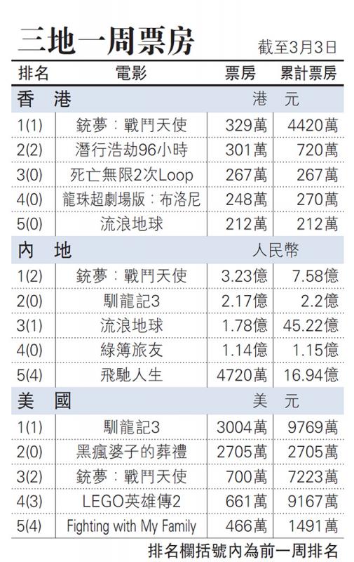 内地票房方面,《铳梦》(内地片名《阿丽塔:战鬥天使》)升了一位,排第一位;动画电影《驯龙记3》(How to Train Your Dragon:The Hidden World)(内地片名《驯龙高手3》)新上画,排第二位;《流浪地球》退居第三位;获奥斯卡“最佳电影”的《绿簿旅友》(Green Book)(内地片名《绿皮书》)新上画,排第四位;《飞驰人生》排第五位。其他贺岁片,《疯狂的外星人》和《新喜剧之王》都跌了三位,分别排第六及第十位。而其他新上画电影,内地惊慄片《逆罪》收七万八千元人民币。