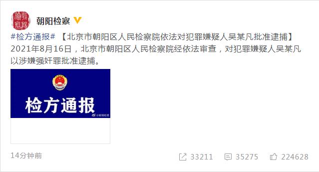 2021年8月16日,北京市朝阳区人民检察院经依法审查,对犯罪嫌疑人吴某凡以涉嫌强奸罪批准逮捕。