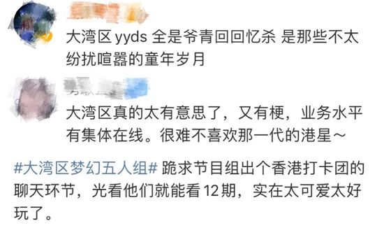 贡献了节目一半笑点的香港哥哥们,最后在网友的拥护下有了全新名字:大湾区梦幻五人组。