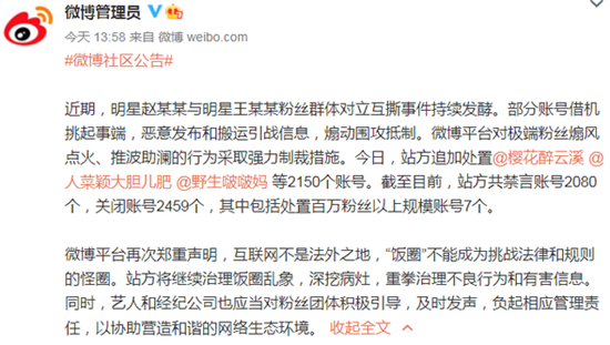 近期,明星赵某某与明星王某某粉丝群体对立互撕事件持续发酵。部分账号借机挑起事端,恶意发布和搬运引战信息,煽动围攻抵制。微博平台对极端粉丝煽风点火、推波助澜的行为采取强力制裁措施。今日,站方追加处置@樱花醉云溪 @人菜颖大胆儿肥 @野生啵啵妈 等2150个账号。截至目前,站方共禁言账号2080个,关闭账号2459个,其中包括处置百万粉丝以上规模账号7个。