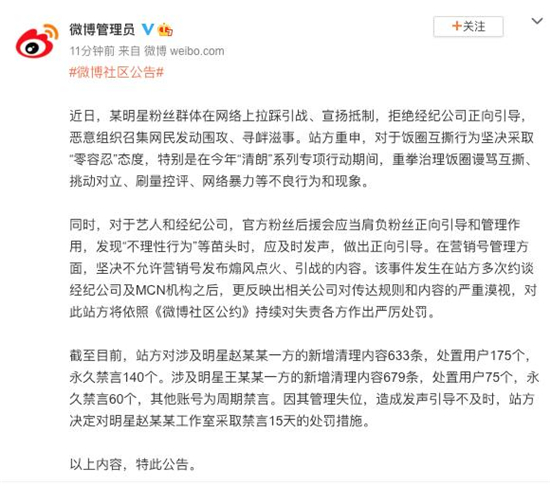 微博平台再次郑重声明,互联网不是法外之地,“饭圈”不能成为挑战法律和规则的怪圈。站方将继续治理饭圈乱象,深挖病灶,重拳治理不良行为和有害信息。同时,艺人和经纪公司也应当对粉丝团体积极引导,及时发声,负起相应管理责任,以协助营造和谐的网络生态环境。
