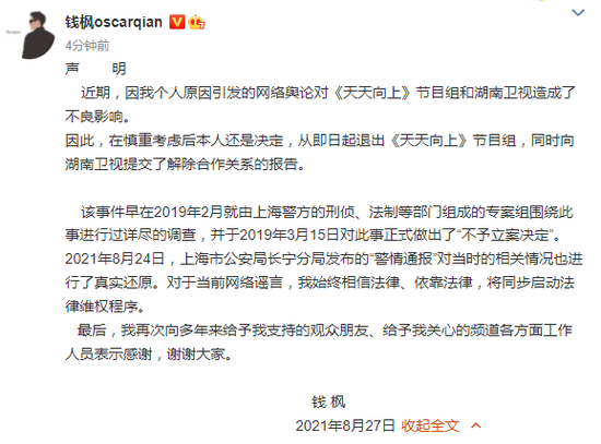 钱枫在其个人微博发布声明称,即日起退出《天天向上》节目组,同时向湖南卫视提交了解除合作关系的报告。