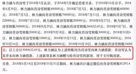 恋爱期间,林力涵声称被肖诗雪骗走300多万元,肖诗雪却指这是用于购房的赠款,男方起诉后又与肖诗雪达成调解,女方退还130万元,男方虽有不满但不想再为此事纠缠,不再追究余下的款项。