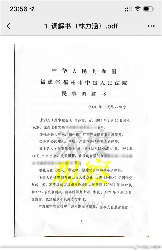 林力涵加了记者的微信之后,很惊讶对方竟然有他的电话,记者说清楚来意后,林力涵发给对方一份调解书以及一段聊天截图。