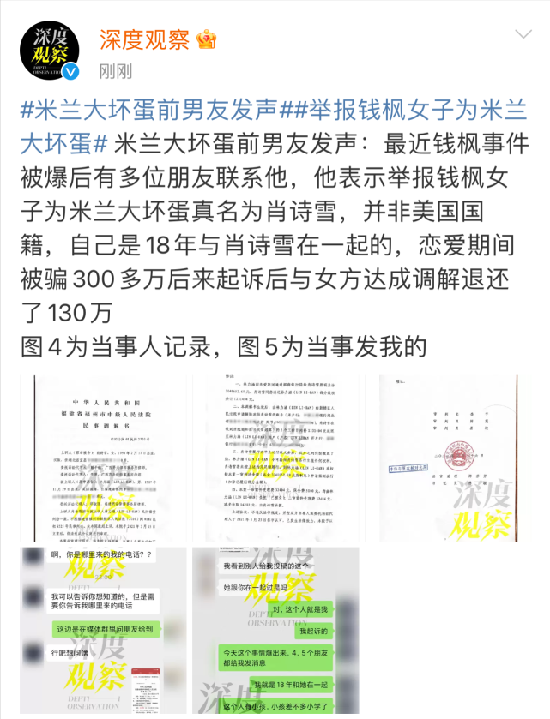 8月25日晚,“米兰”被挖出真实名字为肖诗雪,同时牵扯出她与前男友林力涵(美国国籍)在今年3月判决的300万元借贷案。