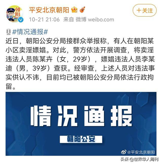 10月21日晚,朝阳警方发布最新通报:接到群众举报,有人在朝阳某小区卖淫嫖娼。