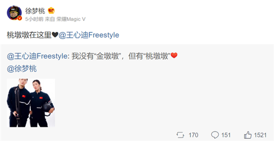 王心迪先在微博上发布两人合影称:“我没有‘金墩墩’,但有‘桃墩墩’。”