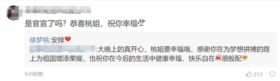 有网友在留言中提问:“是官宣了吗?”徐梦桃回应表示肯定。