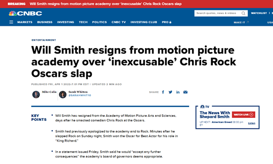 在周五发表的一份声明中,史密斯表示将辞去美国电影艺术与科学学院的成员资格,并将接受董事会认为适当的任何进一步的后果。