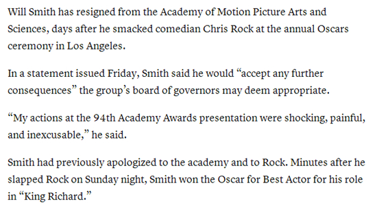 此前,史密斯已向美国电影艺术与科学学院与奥斯卡颁奖嘉宾、喜剧演员克里斯·洛克道歉。在第94届奥斯卡金像奖颁奖典礼上,因不满洛克对其妻子的调侃,史密斯上台掌掴洛克,随后凭借作品《国王理查德》获得奥斯卡最佳男主角奖。