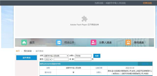 中新经纬查询四川法院网上诉讼服务中心发现,成都天然呆餐饮管理有限公司新增立案信息。根据立案信息,原告是温州欧歌餐饮管理有限公司,被告系上海至丙品牌管理中心(有限合伙),成都天然呆餐饮管理有限公司以及关晓彤。案件立案日期为2022年3月30日,经办人是成都市中级人民法院。