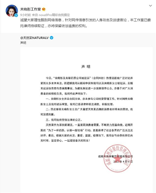 “关晓彤工作室”微博随后转载了天然呆的声明,并表示:“诚望大家理性甄别网络信息,针对网传信息引发的人身攻击及诽谤言论,本工作室已委托律师持续取证,亦将保留依法追责的权利。”